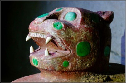 Figura 1. Cabeza de jaguar con incrustaciones de jade, Templo de Kukulcán, Chichén Itzá (https://www.lajornadamaya.mx/opinion/29436/un-jaguar-resucitado).