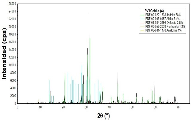 Los datos mineralógicos y geoquímicos fueron organizados en una base de datos y posteriormente descritos y analizados. Por otra parte, se realizó una búsqueda exhaustiva de información en la literatura especializada sobre la composición mineralógica y química de los depósitos de jade expuestos en el valle de Motagua. Esta “huella” mineralógica y química se comparó con la mostrada por las “piedras verdes” de Chichén Itzá. El análisis mineralógico (Figura 5) reveló que el material recuperado en Chichén Itzá está constituido por clinopiroxeno sódico (jadeíta [56-88%] y onfacita [2 y 6%]), mezclado con albita (menos de 37%) y cantidades traza de nontronita (Na0.3Fe2{[Si,Al]4O10}[OH]2 · nH2O), moscovita (KAl2[AlSi3O10][OH]2) y analcima (Na[Si2Al]O6·H2O).