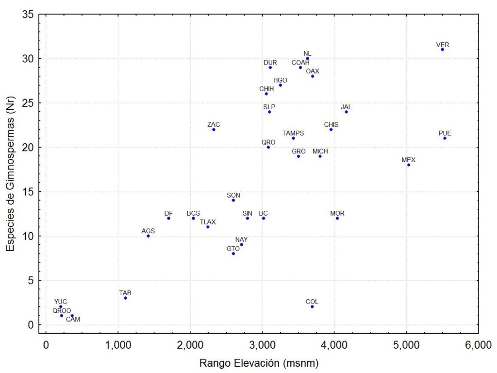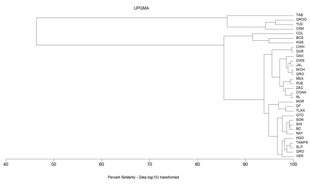 El análisis del grado de similitud entre los estados de México, con base al método de conglomerado jerárquico de las variables: número de especies de gimnospermas, cobertura de bosques de coníferas y rango altitudinal de su territorio, indica la existencia de dos grandes grupos, en el primero se encuentran Tabasco, Quintana Roo, Yucatán y Campeche, que carecen de bosques de coníferas y cuentan por tanto, con no más de cuatro especies de gimnospermas cada uno; el siguiente grupo, se divide a su vez en tres subgrupos, el primero, integrado por Colima, Baja California Sur y Aguascalientes que presentan una escasa cobertura de bosques de coníferas (<1% de su territorio), no más de 12 especies de gimnospermas y un rango de elevación entre los 1,420 y 3,693 msnm; el segundo grupo lo integran: Chihuahua, Durango, Oaxaca, Chiapas, Jalisco, Michoacán, Guerrero, Estado de México, Puebla, Zacatecas, Coahuila y Nuevo León que cuentan con la mayor cobertura de bosques de coníferas en el país (entre 2.2 y 25.4% de su territorio), tienen entre 18 y 30 especies de gimnospermas (donde Nuevo León destaca con 30 especies) y su rango de elevación va de los 2,328 a los 5,533 msnm. El tercer grupo lo constituyen 13 estados, entre los que destacan: Hidalgo, Tamaulipas, San Luis Potosí, Querétaro y Veracruz con la menor superficie de bosque de coníferas (entre 1.4 y 7.9% de su territorio), un rango de elevación de los 3,085 a los 5,500 msnm y el mayor número de especies de gimnospermas (entre 20 y 31 especies) (Figura 9).