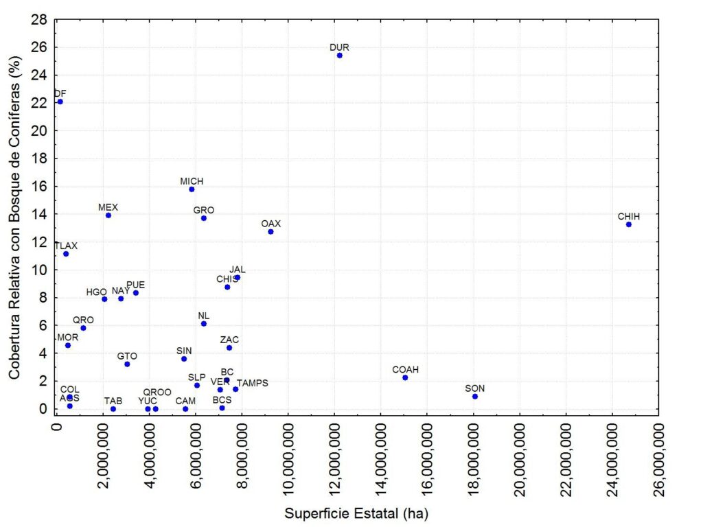 El sistema ecológico bosque de coníferas cubre un total de 13,852,125 hectáreas, es decir, 7.1% del territorio nacional. Con excepción de los estados de Campeche, Quintana Roo, Tabasco y Yucatán, los bosques de coníferas están presentes en todos los estados de la república mexicana. Cinco estados: Chihuahua, Durango, Oaxaca, Michoacán y Guerrero cuentan con el 67% de la superficie de bosques de coníferas del país (Inegi, 2007).