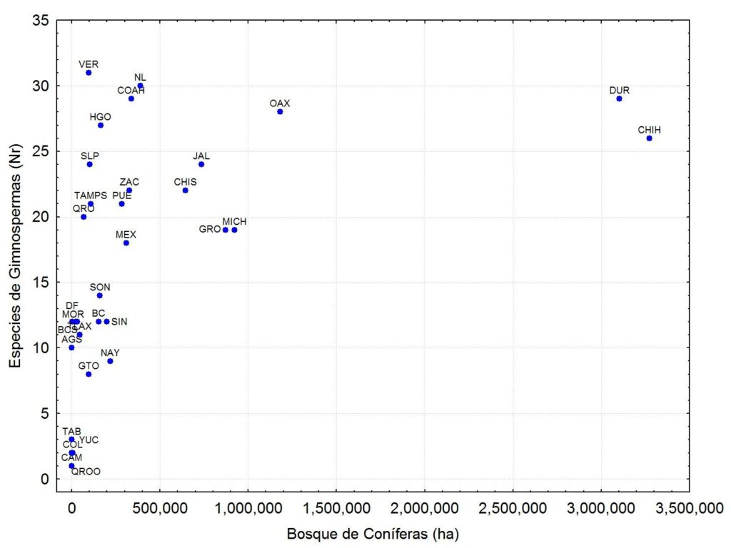 Para México se tiene registro de un total de 150 especies de gimnospermas, además de 63 subespecies, variedades o formas. De éstas, 91 especies corresponden a Coniferophytas, además de 57 categorías infraespecíficas; 52 especies a Cycadophytas y cinco taxones infraespecíficos, así como siete especies a Gnetophytas, más un taxón infraespecífico (Llorente-Bousquets y Ocegueda, 2008). Para el estado de Veracruz se tiene registro de 31 especies de gimnospermas, destacando Nuevo León con 30 especies en el segundo lugar nacional, seguido de Coahuila, Durango, Oaxaca, Hidalgo y Chihuahua. Esto significa, que no obstante la gran superficie con bosques de coníferas que tienen estos estados, con más del 12% de su territorio, son superados en riqueza de especies de gimnospermas por Veracruz y Nuevo León que sólo cuentan con 1.4% y 6.1% de su territorio con este sistema ecológico, respectivamente (Figuras 3 y 4).