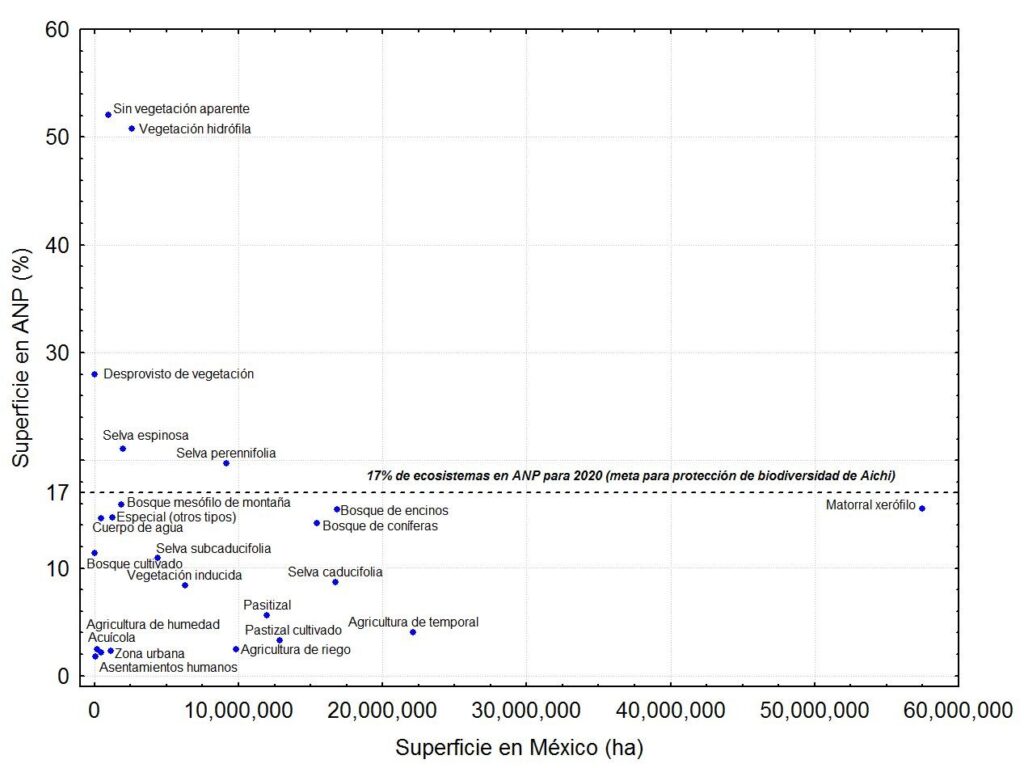 A nivel nacional, el 14% de los bosques de coníferas se encuentra dentro de áreas naturales protegidas (ANP). No obstante que esta cifra es superior a la media mundial y nacional protegida que es del 12%, se debe destacar que entre las metas establecidas para el año 2020 para protección de la biodiversidad en el marco de la Convención para la Diversidad Biológica, en la COP-10 de Nagoya, Japón, también conocida como la meta de Aichi (CDB-PNUMA, 2011), se estableció el compromiso de proteger, al menos, el 17% de los ecosistemas representativos del planeta, por lo que en México, se tiene un déficit en la superficie protegida para los sistemas ecológicos: bosque de coníferas, bosque mesófilo de montaña y bosque de encinos, entre otros (Figuras 5 y 6).