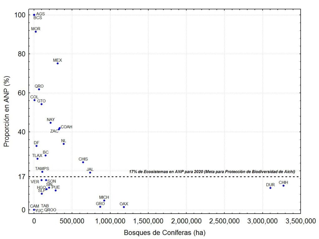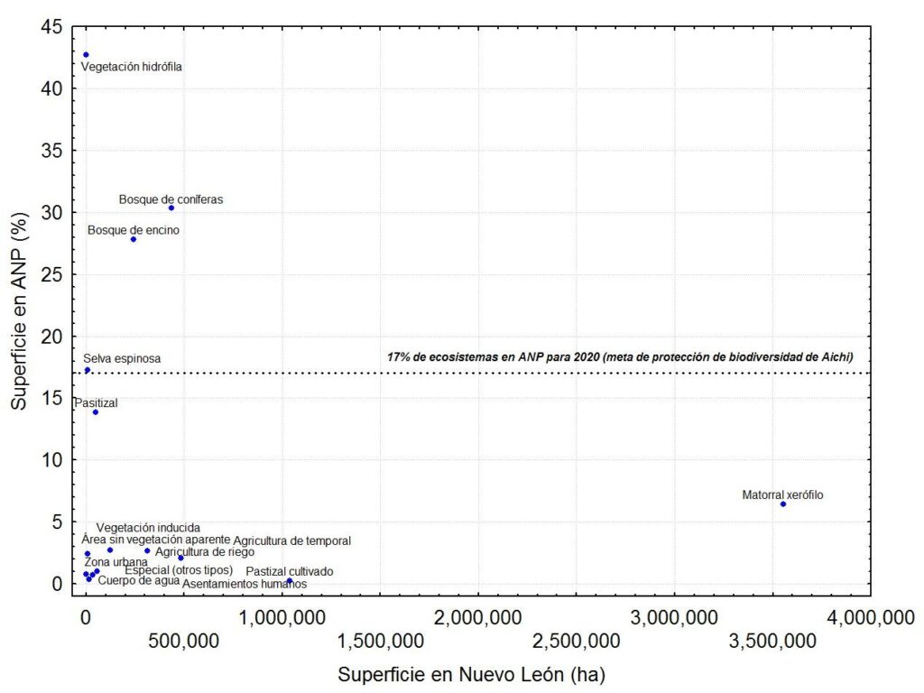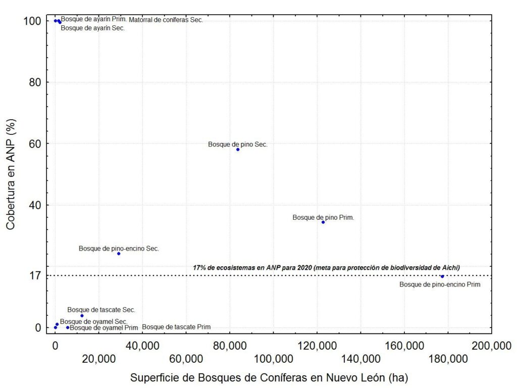 En Nuevo León, sólo 10.6% de su territorio está cubierto por bosques templados, 6.8% de bosques de coníferas y 3.8% de bosques de encinos. Los tipos de vegetación del sistema ecológico bosque de coníferas cuya cobertura en ANP está por debajo de la meta de Aichi (17%) para protección de la biodiversidad son el bosque de táscate, bosque de oyamel y bosque de encino-pino primario (Figura 8).