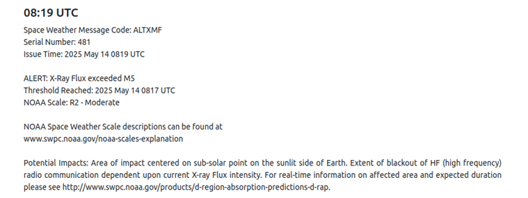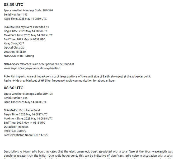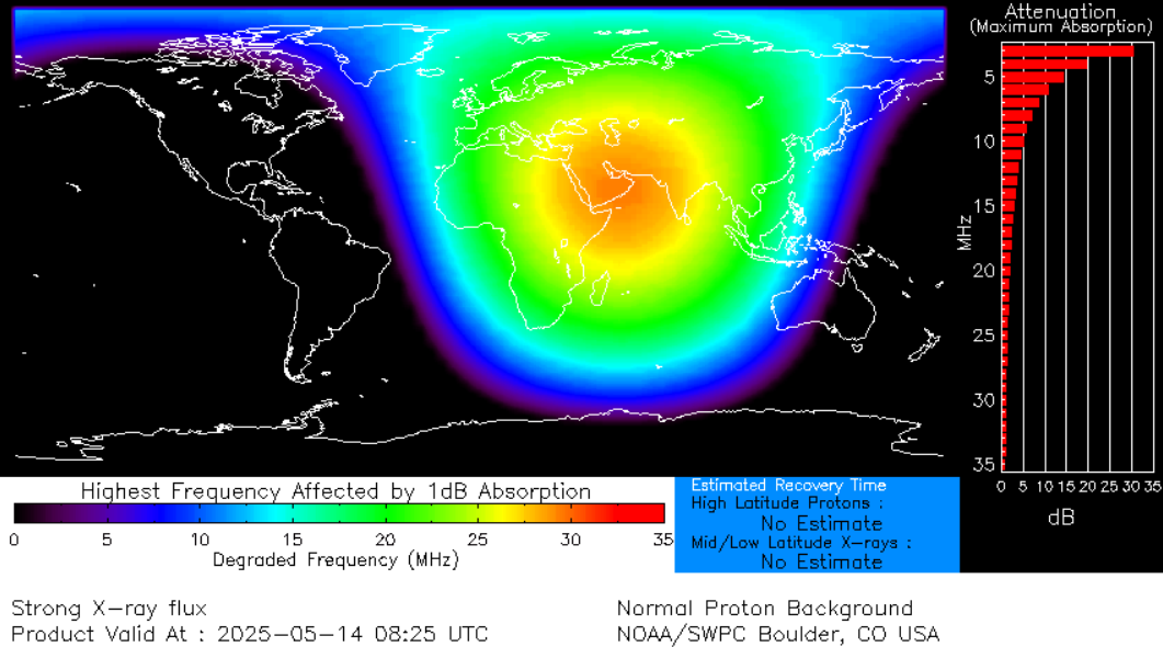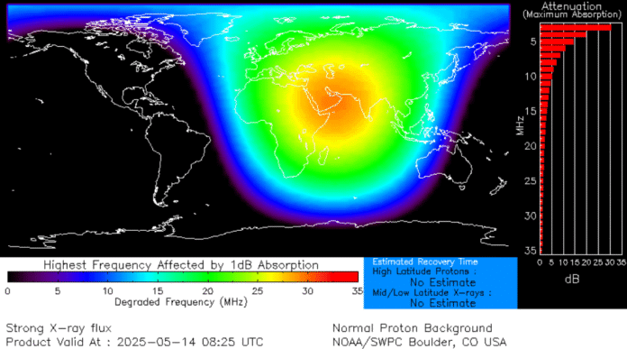 La radiación liberada durante la fulguración del 14 de mayo causó bloqueos a las radiocomunicaciones en la banda de los 30 a 35 MHz en países de Europa Central y el Noreste de África (ver Figura 3).
