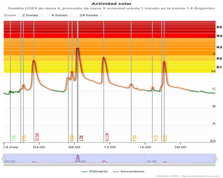 El 14 de mayo, cerca de las 8:20 de la mañana (hora universal), el Sol lanzó una llamarada súper intensa de tipo X2.7 desde su región activa 4087. Fue la más fuerte de cuatro explosiones que soltó ese día, y aunque no apuntó directo a la Tierra, se notó con claridad en las imágenes de rayos X y en los datos del satélite GOES.