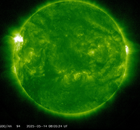 Las fulguraciones son causadas por movimientos del plasma solar y campos magnéticos muy intensos, los cuales, a su vez, pueden generar desprendimientos de material o plasma hacia el medio interplanetario (erupciones solares). En este caso, la fulguración del 14 de mayo estuvo acompañada de una erupción solar que no estuvo dirigida hacia la Tierra, por lo que no se registró una tormenta geomagnética asociada a esta erupción.