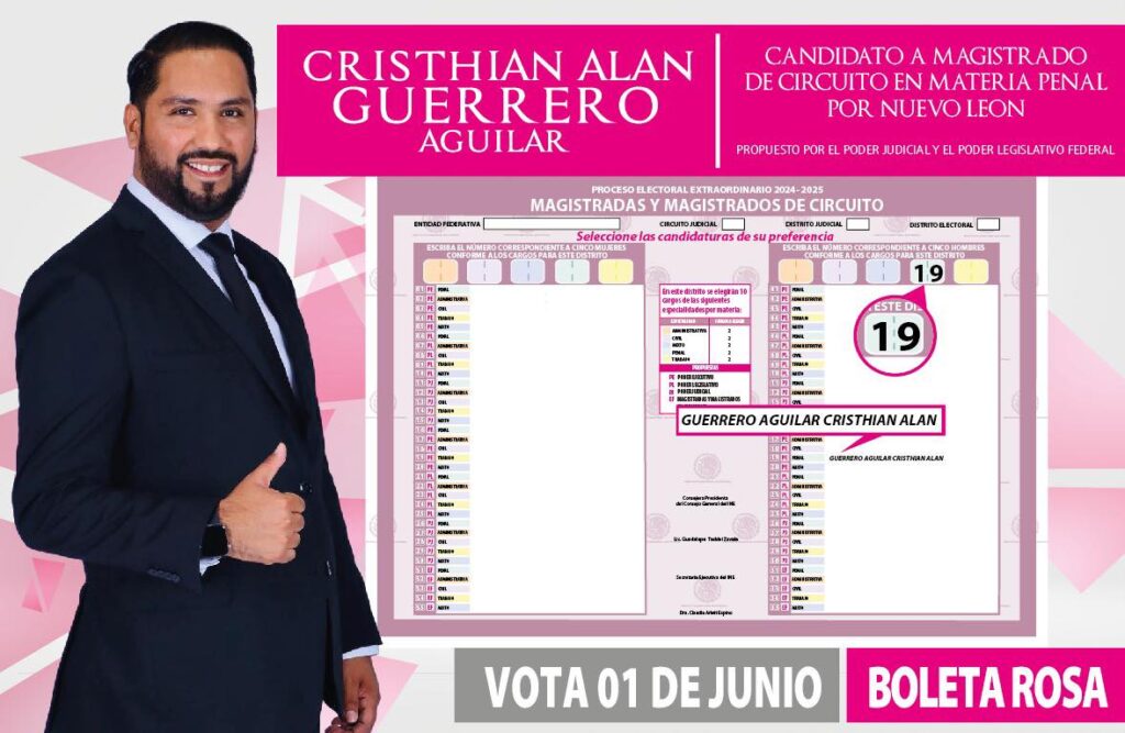 Cristhian Alan Guerrero Aguilar se ha distinguido por su labor jurídica y social en defensa de sectores vulnerables. Su nombre aparecerá en la boleta rosa con el número 19, en lo que representa un parteaguas en la democratización del Poder Judicial mexicano.