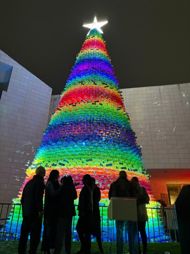 El momento más esperado llegó con el Encendido del Pino, una obra de arte con estructura cónica diseñada por Sergio Rodríguez. Inspirado en los sarapes mexicanos, el diseño incorpora franjas, contrastes y ritmos visuales que evocan tradición, memoria y la fuerza simbólica de las artes textiles nacionales.