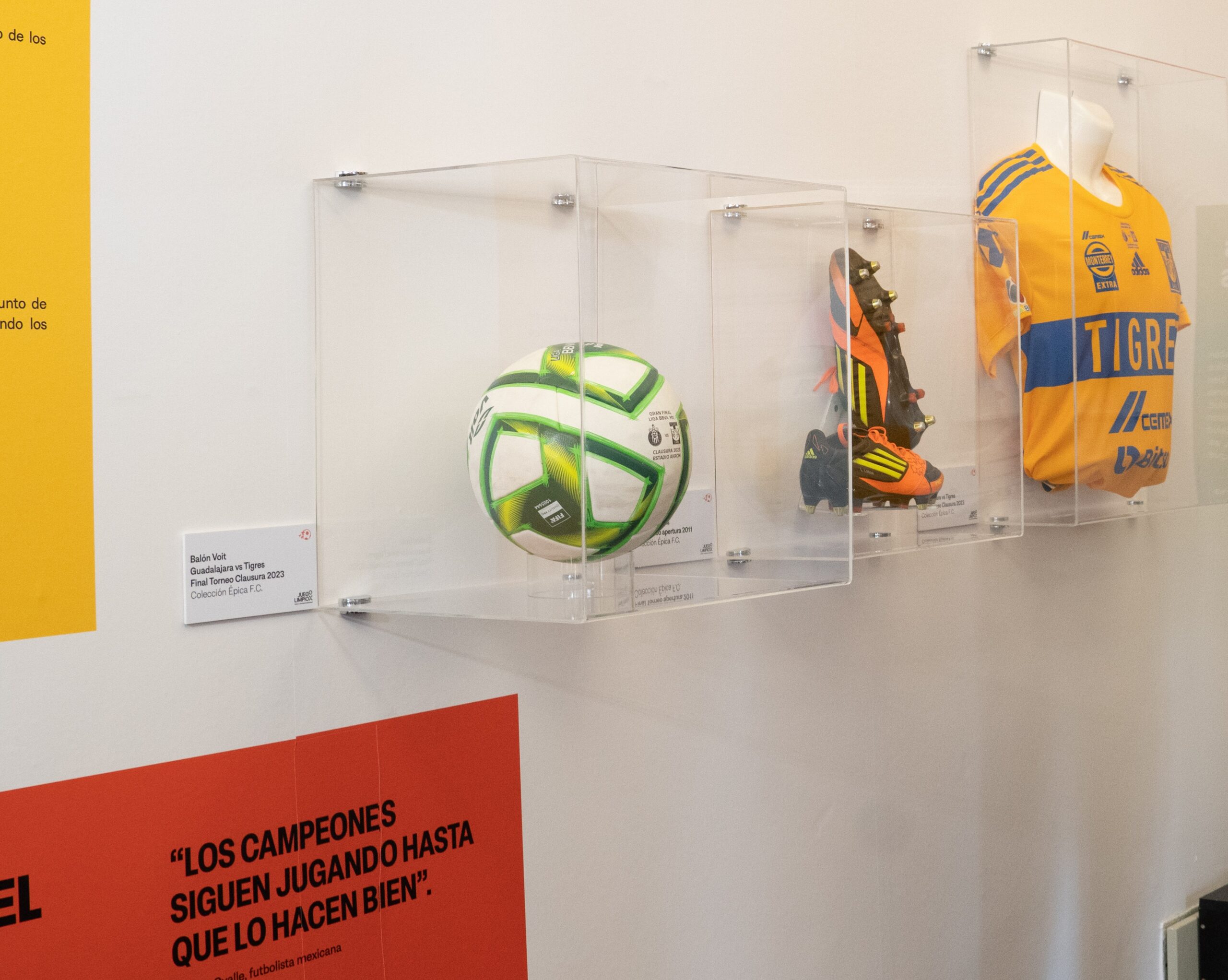 La muestra también incluye símbolos del futbol regiomontano como las butacas del Estadio Tecnológico y del Estadio Universitario, además de recuerdos icónicos como el reconocimiento entregado a Pelé en 1982 y la medalla de campeón del Torneo Clausura 2023, que conectan pasado y presente del balompié en la ciudad.