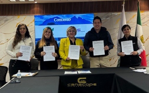 El convenio fue firmado por Catalina Domínguez Estrada, presidenta de CANACOPE Monterrey; Héctor Aguilar Amaya, director del plantel de CONALEP Nuevo León; Belinda María Martínez Rodríguez, del CONALEP Adrián Sada Treviño; y María Maldonado Guerra, directora del plantel Santa Catarina.