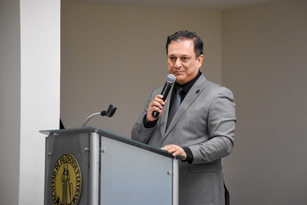 Lo acompañaron en el presídium el Dr. Gerardo Enrique Muñoz Maldonado, Director de Sistema de Posgrados de la UANL; y el Dr. Felipe Abundis de León, Secretario del Área de Estudios de Posgrado de la FFyL.