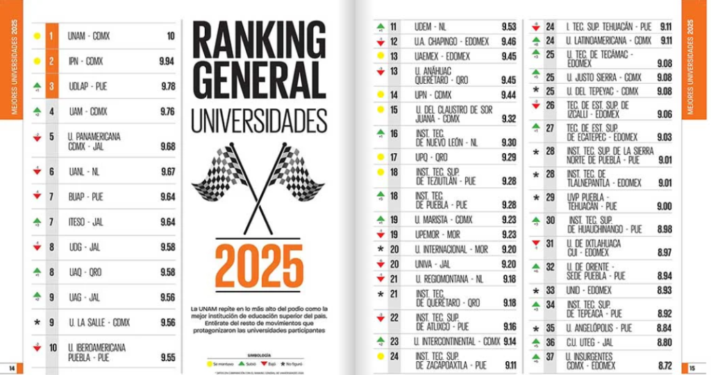 Tal como ocurrió en la edición anterior, la Universidad Nacional Autónoma de México (UNAM) se posicionó en la cima del listado, seguida de cerca por el Instituto Politécnico Nacional (IPN) y la Universidad de las Américas Puebla (UDLAP), esta última ascendiendo un puesto respecto a la publicación de 2024.