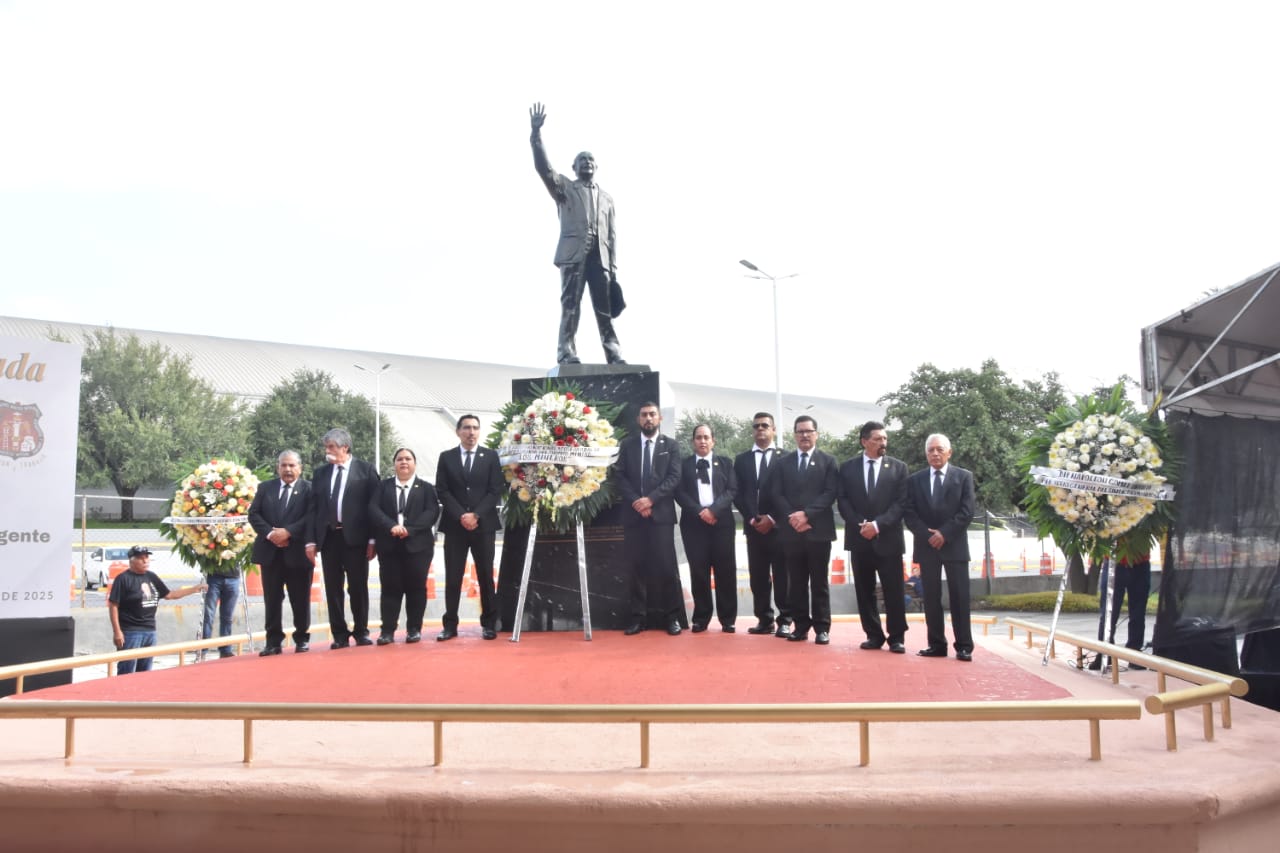 El acto conmemorativo tuvo lugar en el acceso 2 del parque, donde se encuentra la estatua de bronce del dirigente sindical originario de Cadereyta, Nuevo León.