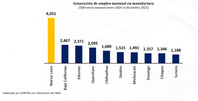 Nuevo León inició 2026 como la principal entidad generadora de empleos en el sector manufacturero del país, al registrar 6 mil 051 nuevos puestos de trabajo durante enero, de acuerdo con información del Instituto Mexicano del Seguro Social.